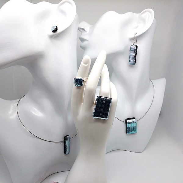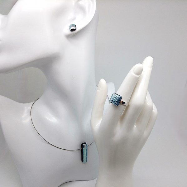 Gestreifter dunkelblauer Untergrund mit Silber-Türkis Reflektionen. Aufgedampfte Metalloxyde (Dichroic Glas), nicht abwaschbar, nicht gemalt sondern geschmolzen und somit permanent. Jedes Stück ist ein Unikat.